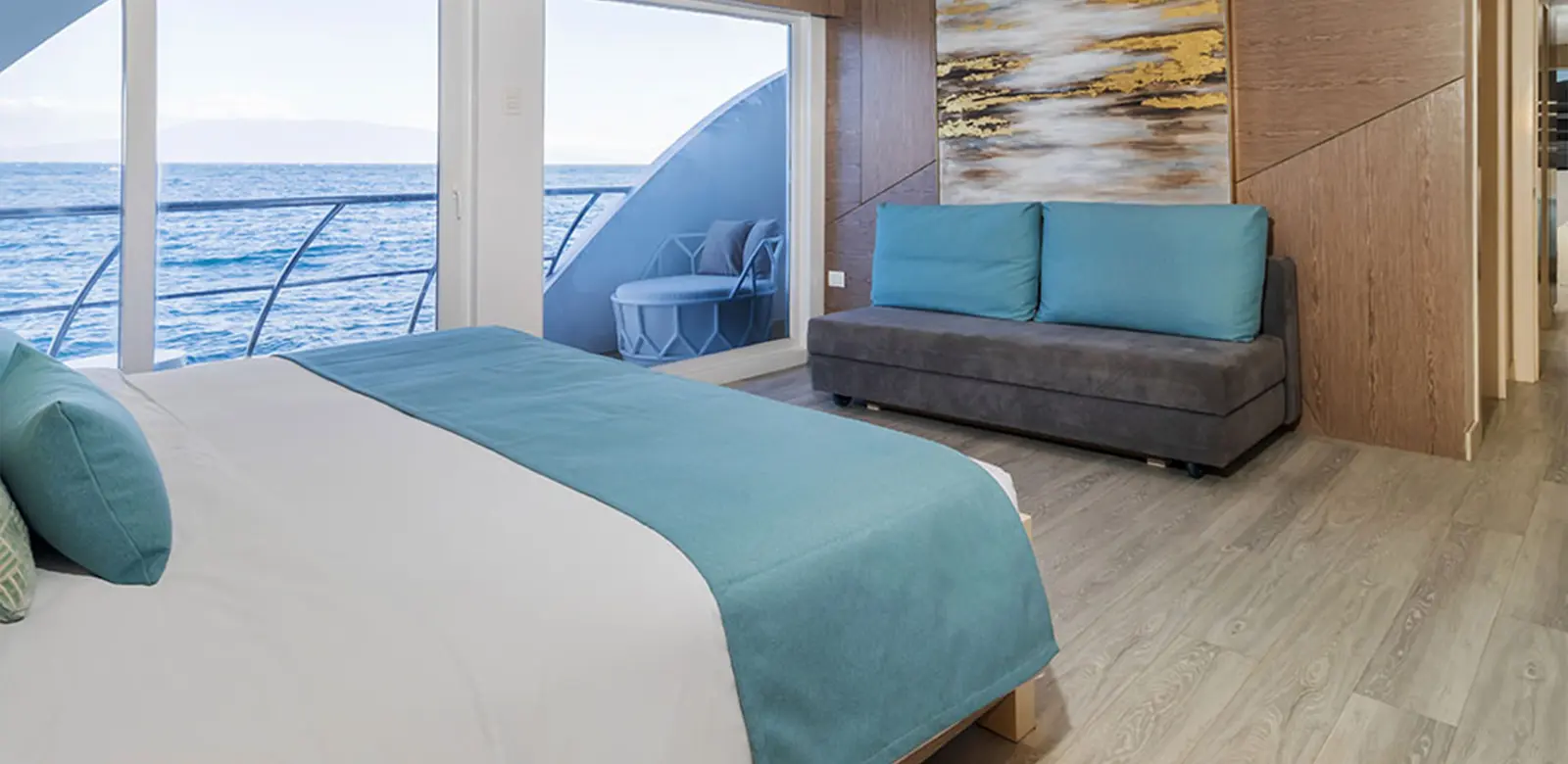 On the main deck of the Elite, there are four Golden suites, two of which have a private balcony with panoramic sliding glass doors and windows facing the front. Families or small parties can make use of the connecting door between the two suites situated at the catamaran's port.